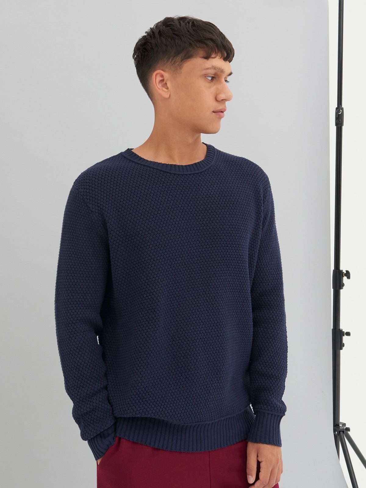 70% Cotone rigenerato, 30% poliestere riciclato. Maglione girocollo, maniche a giro, polsini e collo a costine, maglia in punto riso. Etichetta strappabile.