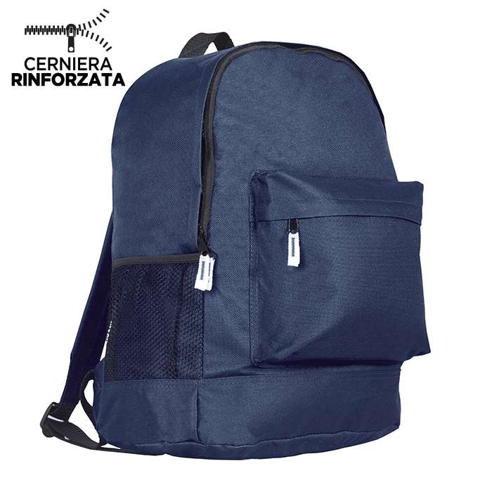 zaino nylon 600D; tasca anteriore; tasca laterale in materiale traforato; spallacci e retro imbottiti; tecnica di stampa consigliata: serigrafica - transfer
