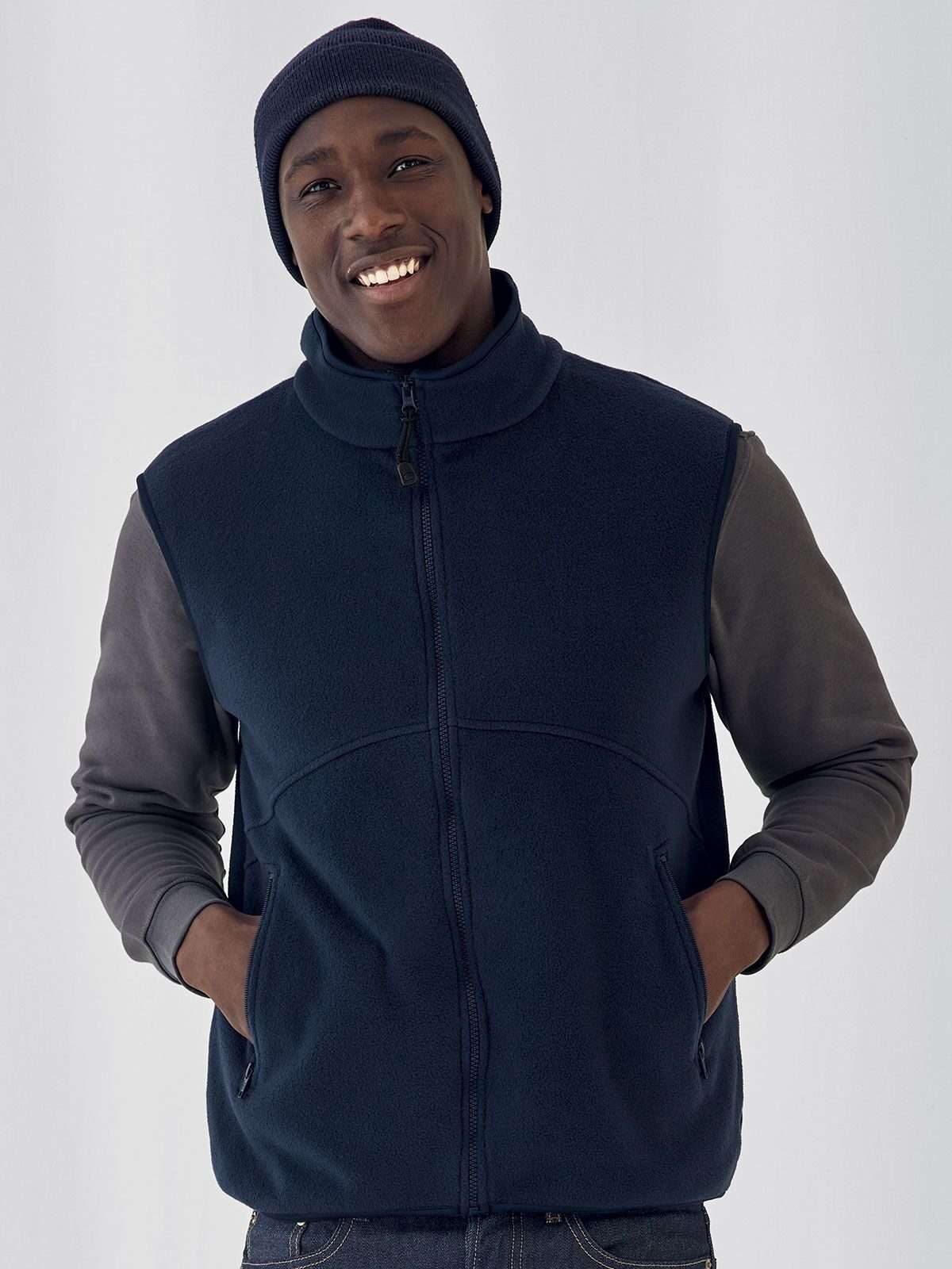 100% poliestere. Anti-pilling. Pile smanicato, 2 tasche, zip intera, struttura con cuciture laterali.