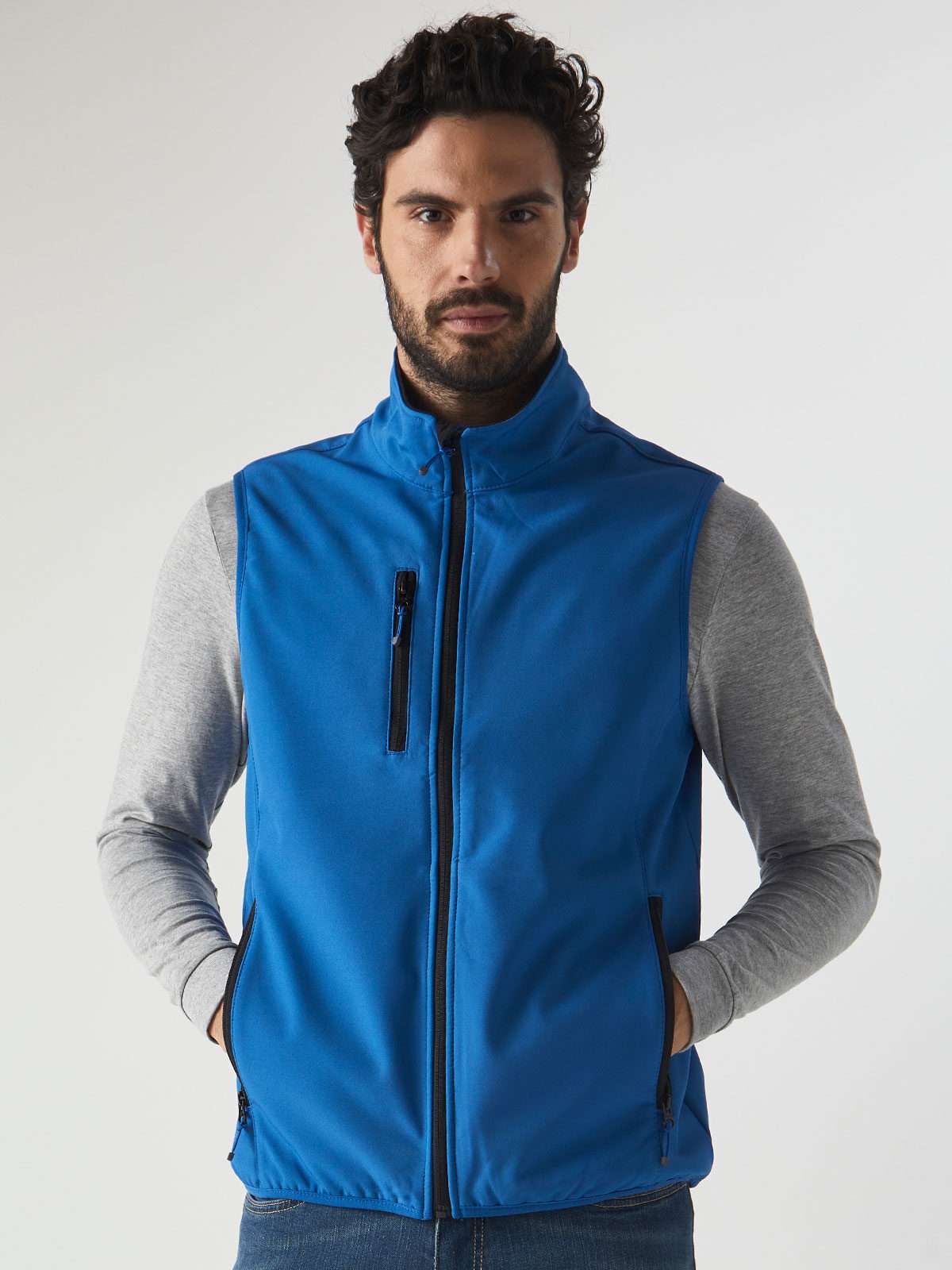 96% poliestere, 4% elastan. Gilet in softshell a 2 strati, micropile, 2 tasche laterali con cerniera, una tasca al petto con cerniera. Etichetta strappabile.