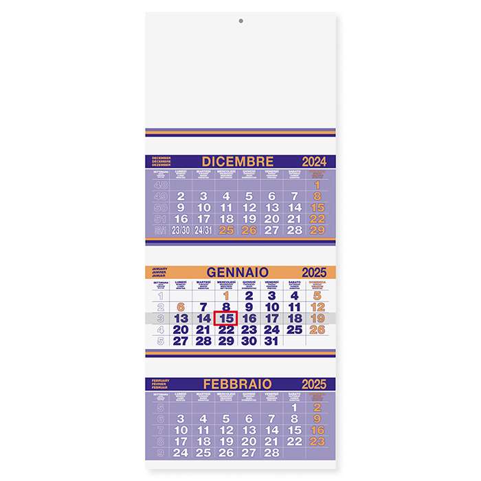 calendario trittico; testata rinforzata; carta naturale 70 gr.; 3 blocchi dorsati e perforati; corredato di cursore gi�� montato; colori fluo; tecnica di stampa consigliata: adesivo digitale - serigrafica