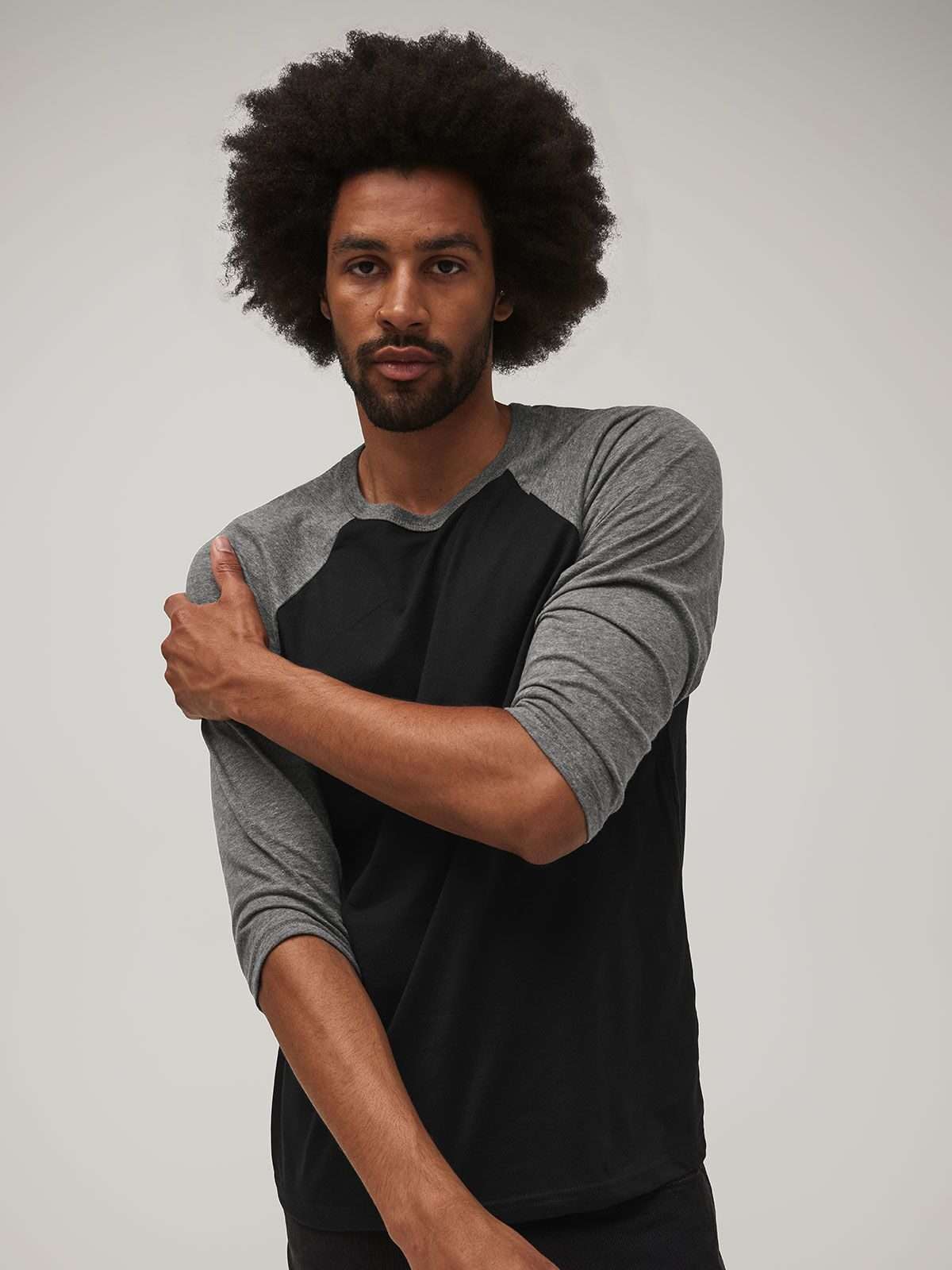 52% cotone pettinato ring-spun, 48% poliestere. T-shirt baseball manica 3/4 raglan, girocollo di colore contrastante. Vestibilità moderna, struttura con cuciture laterali.