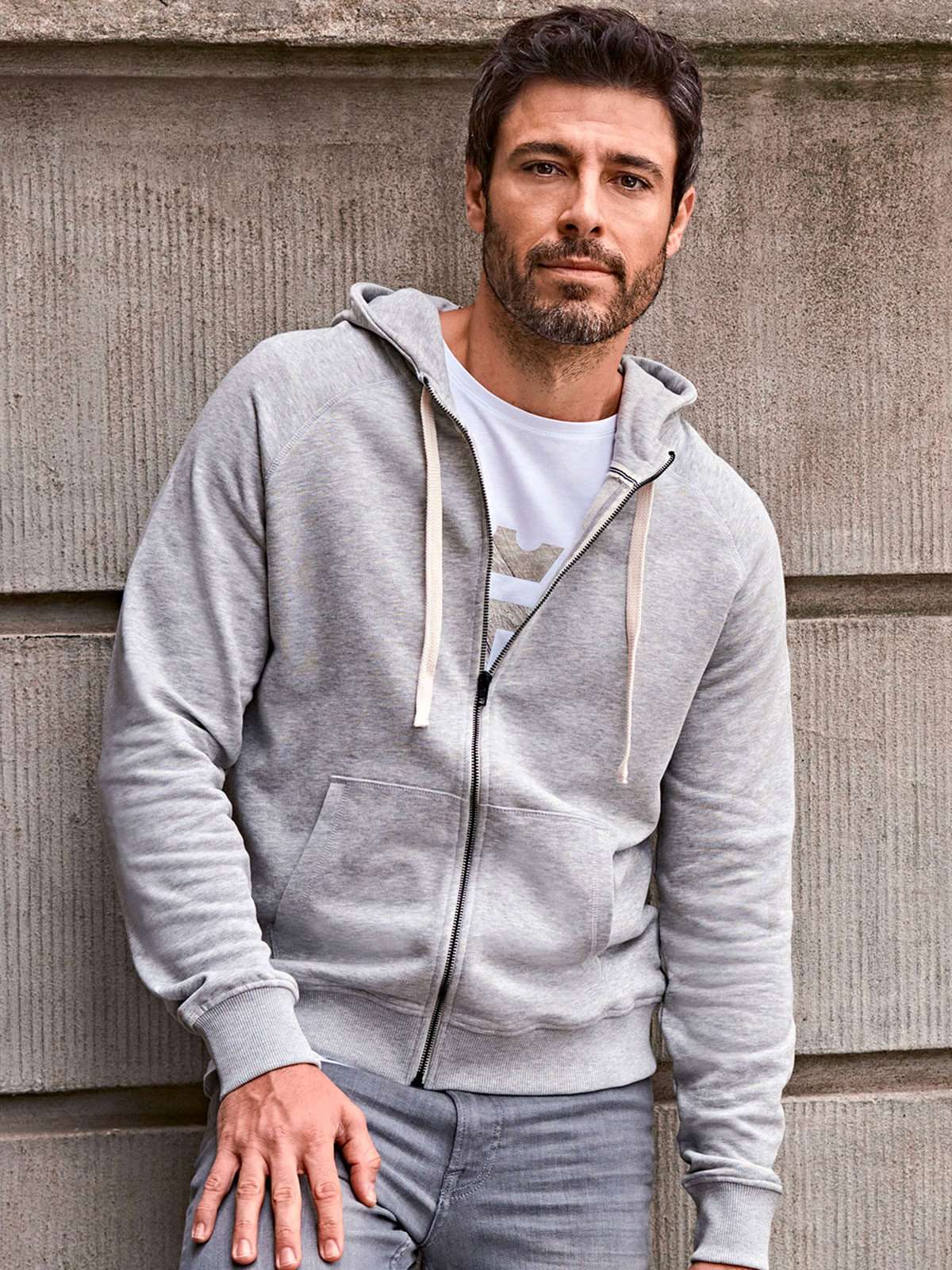 100% cotone pettinato ringspun. Felpa con maniche raglan, zip intera di colore contrastante, cappuccio con cordoncino piatto in contrasto, polsini e orlo inferiore in costina con elastane, tessuto in fibra lunga di cotone egiziano, trattamento agli enzimi che dona al tessuto un tocco morbido. Sgarzata, struttura con cuciture laterali. Col. 007: 80% cot. 20% pol.