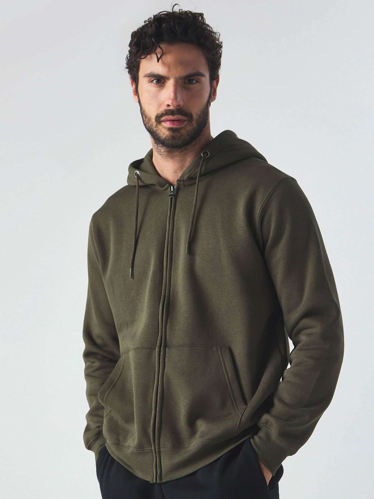 70% cotone, 30% poliestere. Felpa con cappuccio a doppio strato, felpata internamente, maniche set-in, cerniera tono su tono coperta, occhielli in metallo, cordini con punta in metallo, tasca a marsupio, orlo inferiore e polsini in costina, struttura con cuciture laterali. Etichetta strappabile. Interno in poliestere ed esterno 100% cotone.