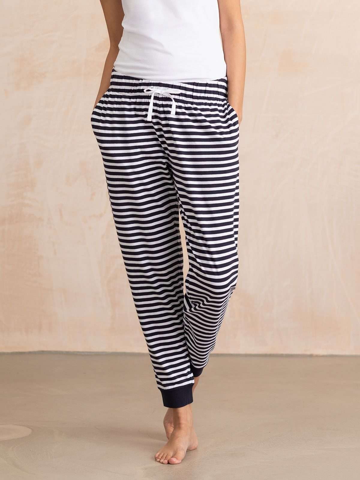96% cotone, 4% elastan. Pantaloni da donna single jersey con vita elasticizzata e cordini, orlo con polsino, tasche laterali, etichetta strappabile.