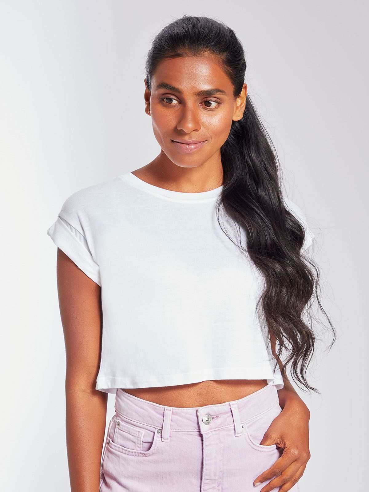 100% cotone organico. Single jersey, ring-spun. Top manica corta, set-in, colletto in costina 1x1, nastro di rinforzo alle spalle. Taglio femminile, più corto, giromaniche con orlo arrotolato. Struttura con cuciture laterali. Etichetta strappabile. Prodotto certificato GOTS.