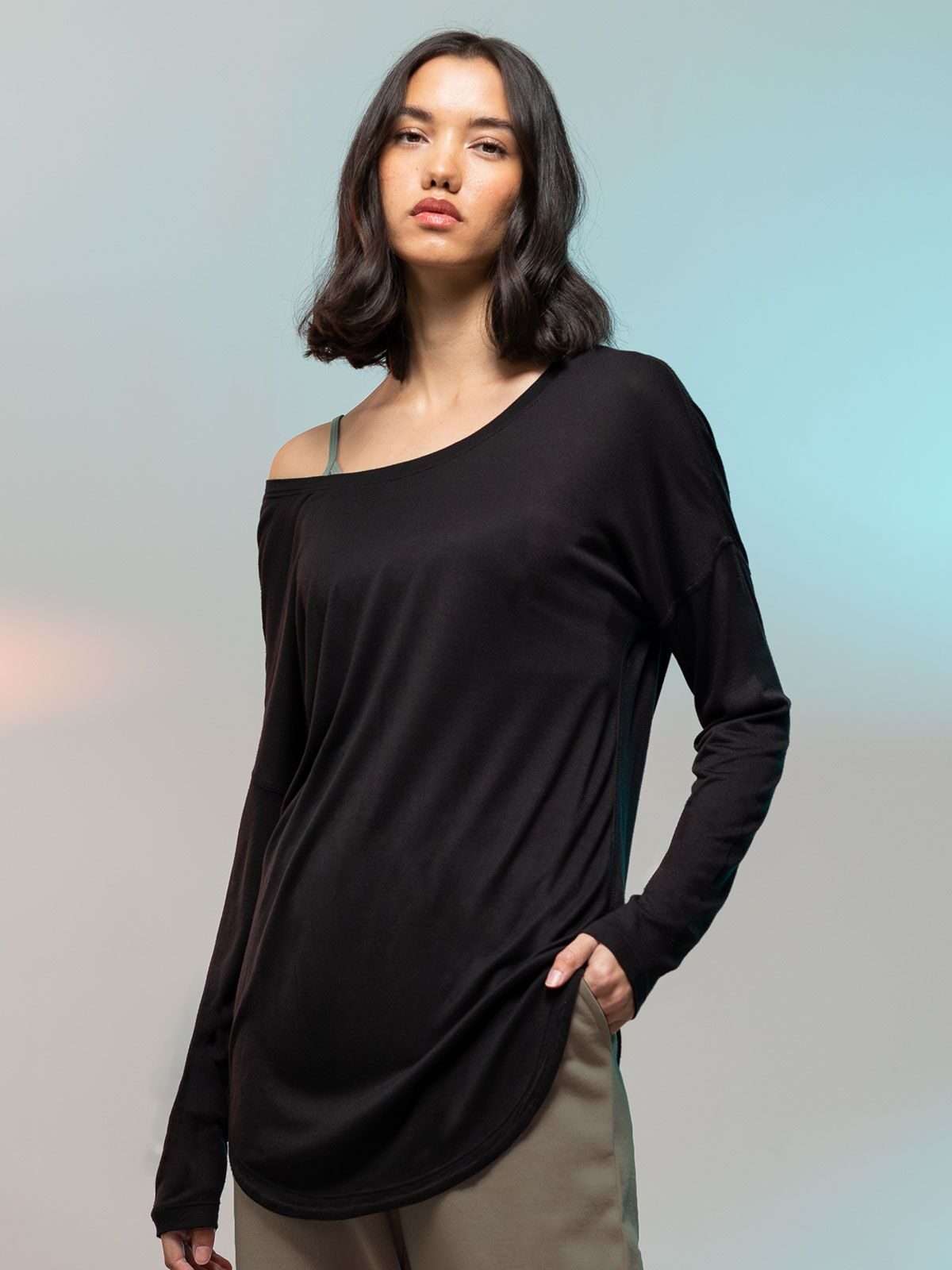 100% viscosa, single jersey. T-shirt manica lunga, set-in, girocollo profondo, cuciture piatte e rinforzate in elastane sulle spalle, etichetta strappabile, struttura con cuciture laterali e cucitura centrale posteriore. Orlo arrotondato, doppie cuciture su collo, polsini, maniche e orlo.