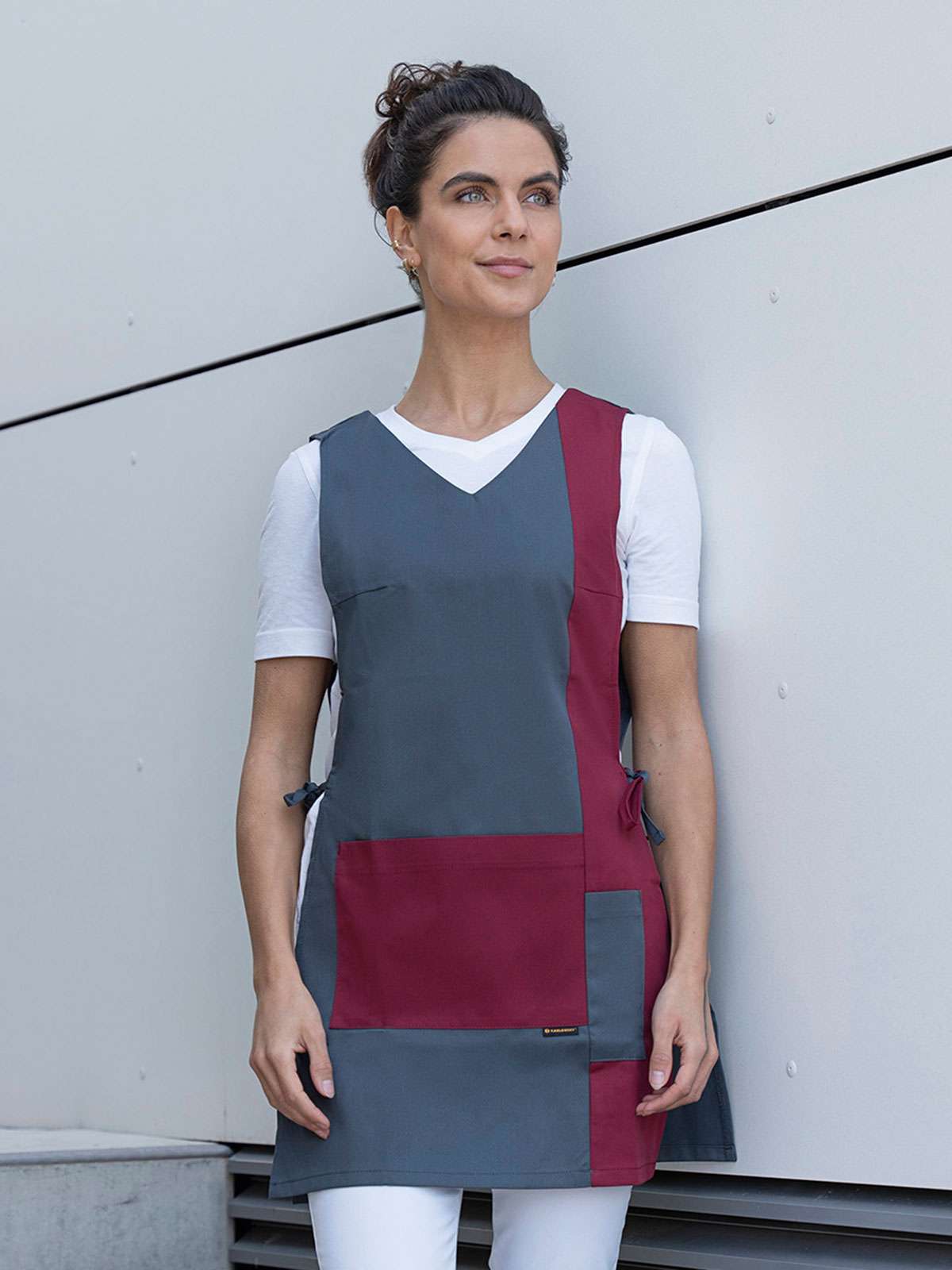 65% poliestere, 35% cotone. Tunica in tessuto rifinito e irrestringibile. Busto con pence, due tasche frontali con cuciture nascoste, adatta al lavaggio industriale, laccetti laterali.