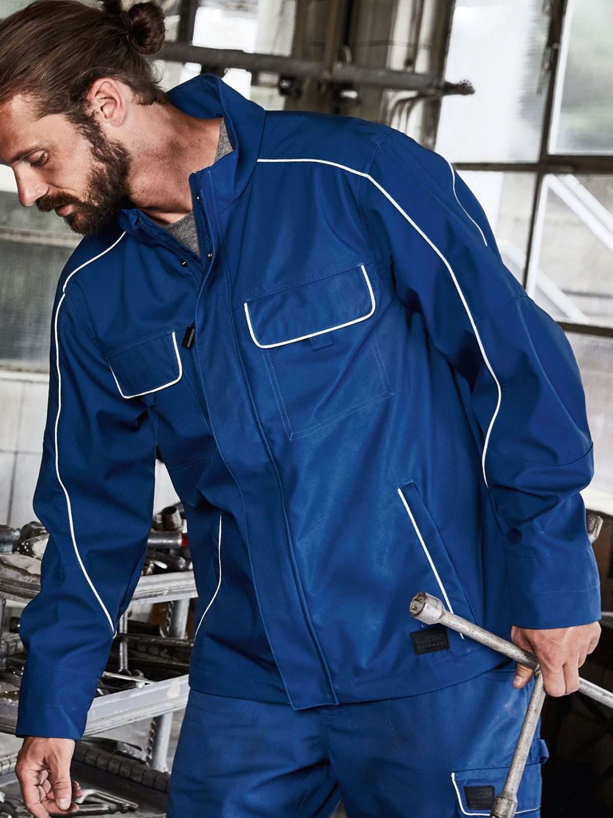 100% poliestere. Giacca in softshell robusta, resistente e leggera, interlock interno, antivento e idrorepellente (colonna d'acqua 2,000 mm), traspirante e permeabile al vapore (2,000g/m²/24h), collo alto, maniche ergonomiche, retro esteso, bande interno manica, zip interna nascosta con protezione per il mento, tasche laterali con zip e tasche interne, tasche sul petto con cucitura su un solo lato per facilitare la decorazione, tasche interne, dettagli riflettenti (senza funzione protettiva / senza DPI) su tasche, spalle e sul retro, zip YKK. Per evitare che il prodotto si rovini, tutti i bottoni e le zip sono nascosti.