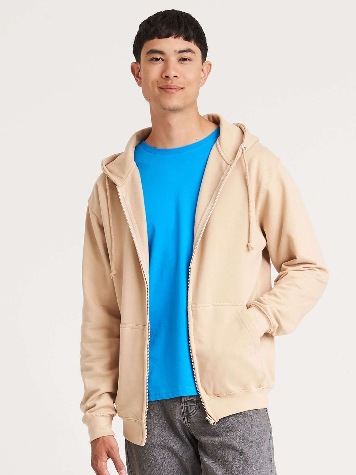 80% cotone, 20% poliestere. Felpa con cappuccio e zip intera coperta, doppie cuciture e cappuccio a doppio strato, tasca a marsupio, polsini e orlo a coste, etichetta strappabile. Produzione certificata WRAP (Worldwide Responsible Accredited Production)